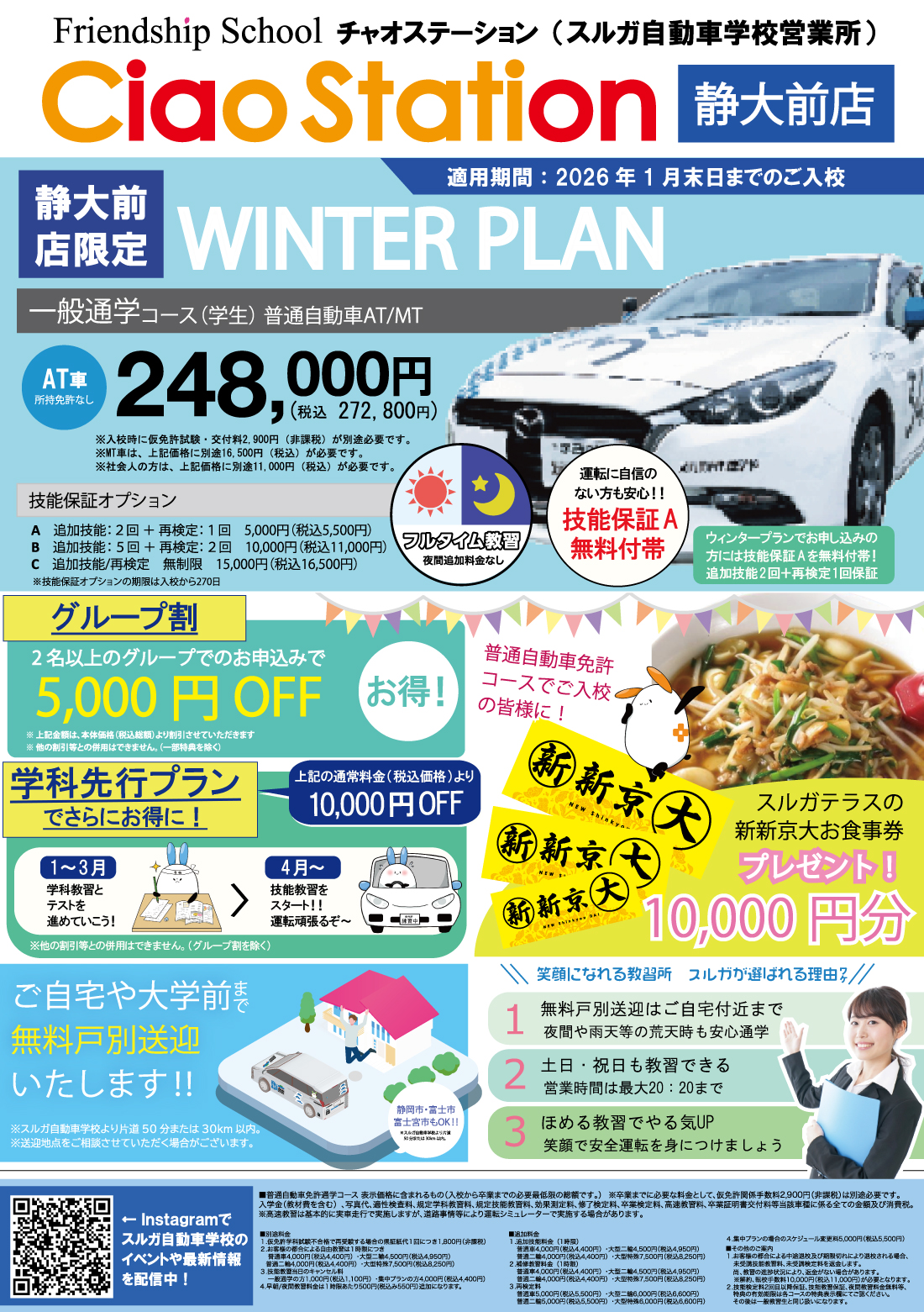 静岡大学から徒歩約7分 スルガテラス内に スルガ自動車学校営業所 Ciao Stationがあります。 Ciao Station 静大前店限定のキャンペーン実施中! 静大前店でお申込みしていただいた方が対象です! ぜひ、ご利用ください。